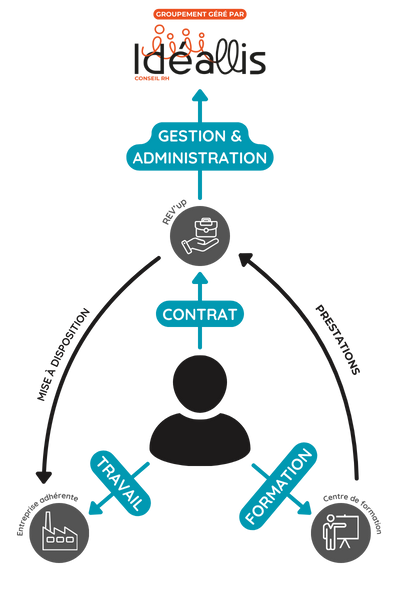 Les salariés du groupement REV’up ont un contrat de travail unique avec le groupement d’employeurs. Ils sont mis à disposition des adhérents et ont l’assurance de toujours travailler grâce au large réseau d’employeurs du groupement et la complémentarité de ses adhérents. En période de basse activité, les salariés suivent des formations individualisées et qualifiantes avec notre entité Idéallis Formation.